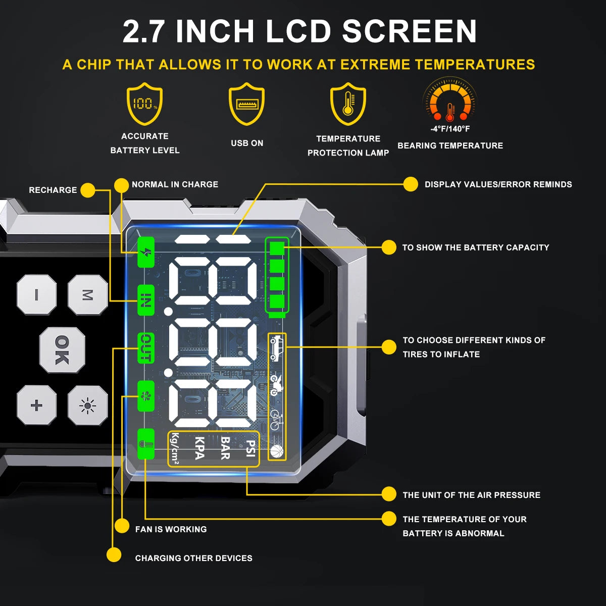 🌀 Built-in air compressor inflates tires in seconds with precise digital control.